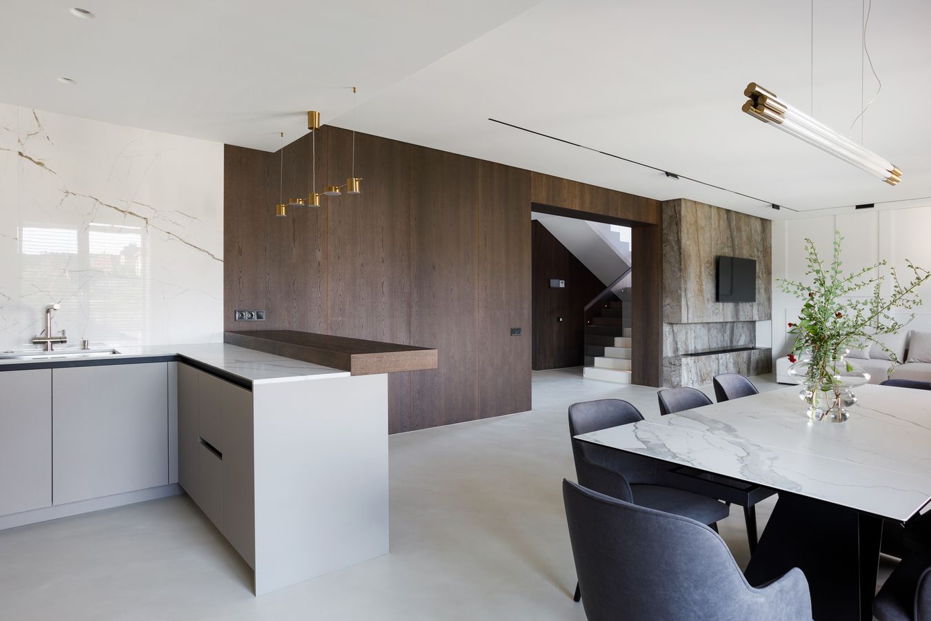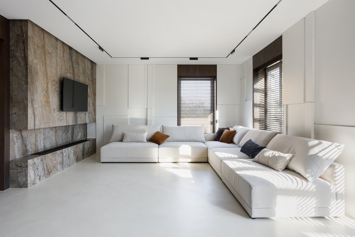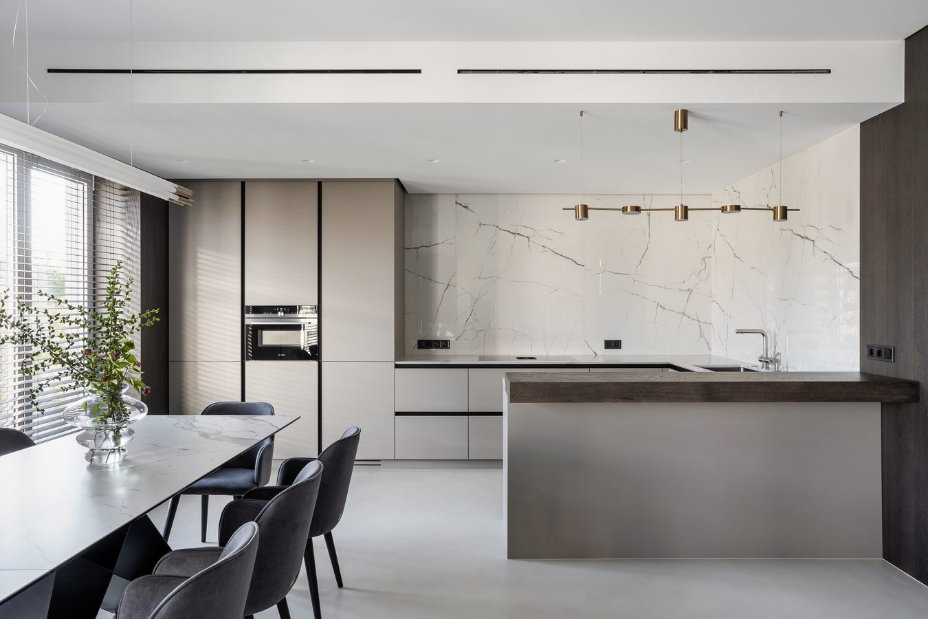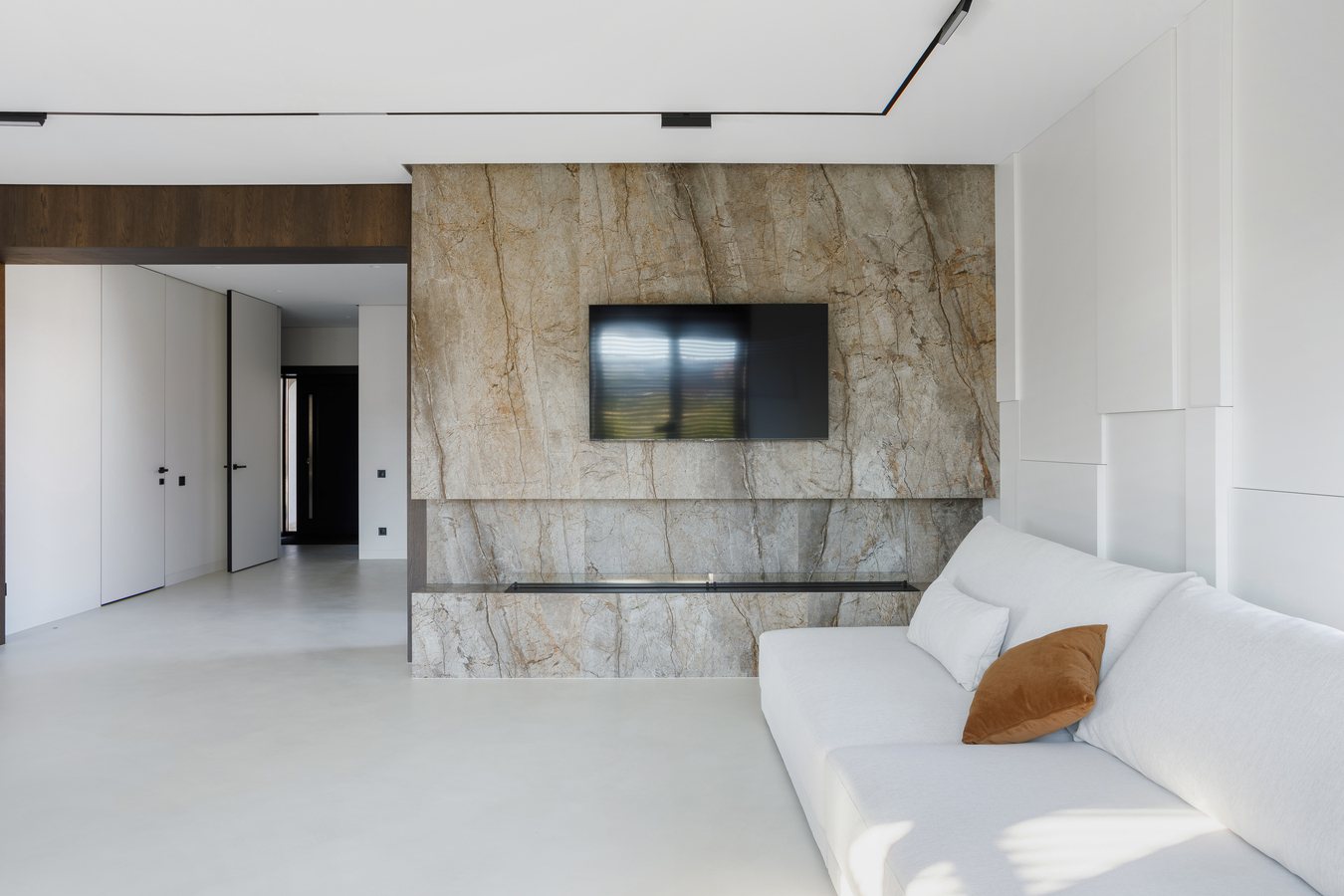 В оздобленні інтер'єру ми використали двері та плінтус прихованого монтажу , профіль тіньового шва, покриття підлоги мікроцементом. Ці елементи є невід'ємними частинами даного інтер'єру - це не тільки красиво, а й дозволить захистити його у первозданному вигляді протягом багатьох років.